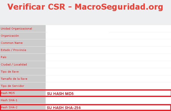 En la imagen de abajo se muestra la pantalla que verá tras verificar el CSR, donde visualizará todos los datos recientemente mencionados. En especial, están marcados los Hashes que debe copiar y mantener durante todo el proceso de validación.