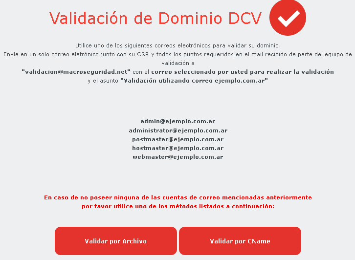 Por un lado, se le proveerán los correos electrónicos con los que podría validar su dominio (el COMMON NAME utilizado en la generación del CSR) mediante el método de validación por email. En caso de no poseer ninguno de los correos definidos por la CA (Autoridad Certificante), podrá elegir un método de validación alternativo, que es la validación de dominio por archivo de texto, o por generación del registro DNS CNAME.